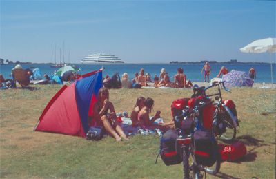 wir einen sehr schönen Badeplatz. Wir müssen zwar die Räder und den Hänger über einen Deich wuchten und der Platz ist auch gut besucht, haben dann aber einen tollen Strand. Die Sonne brennt vom Himmel und